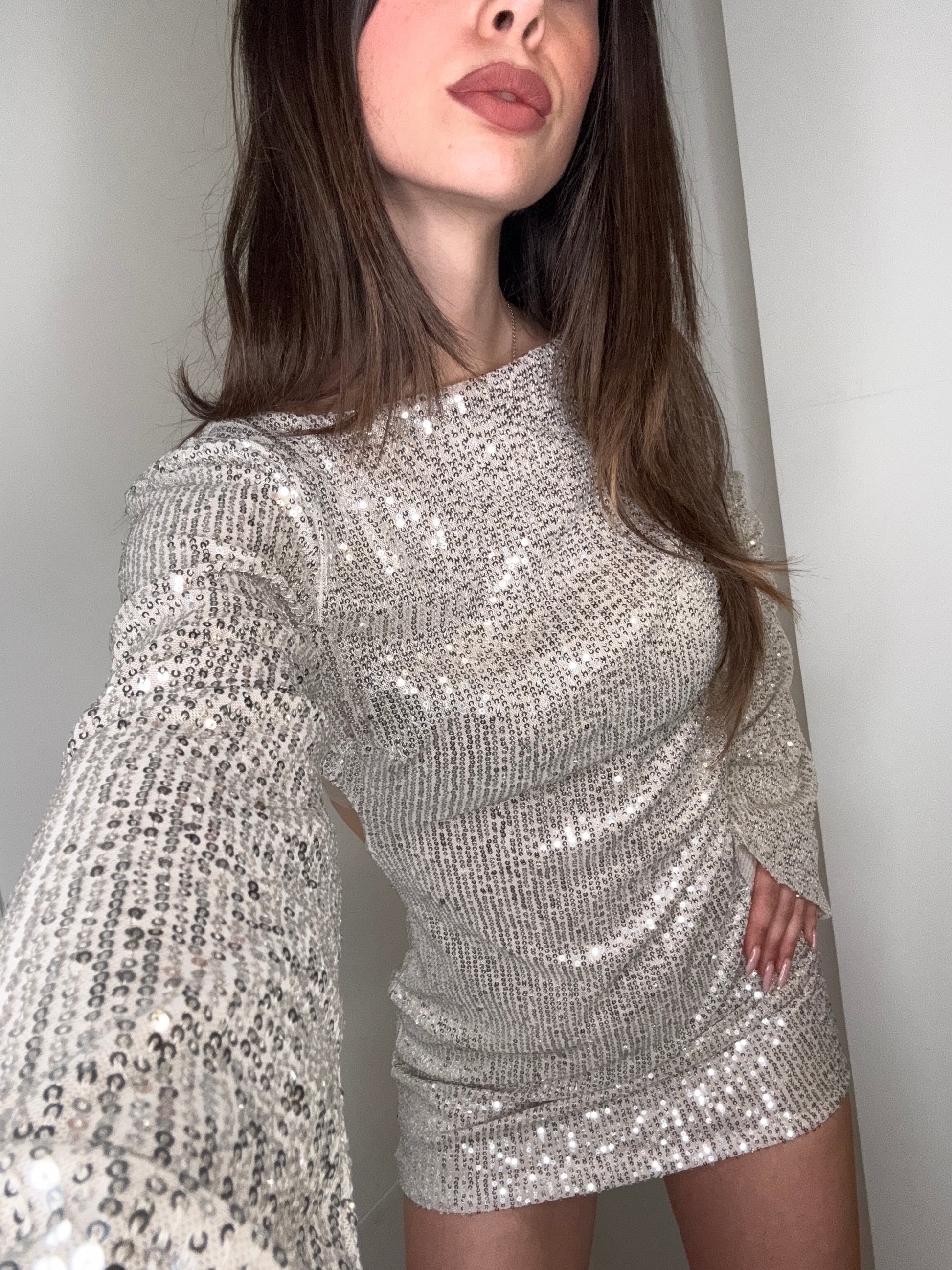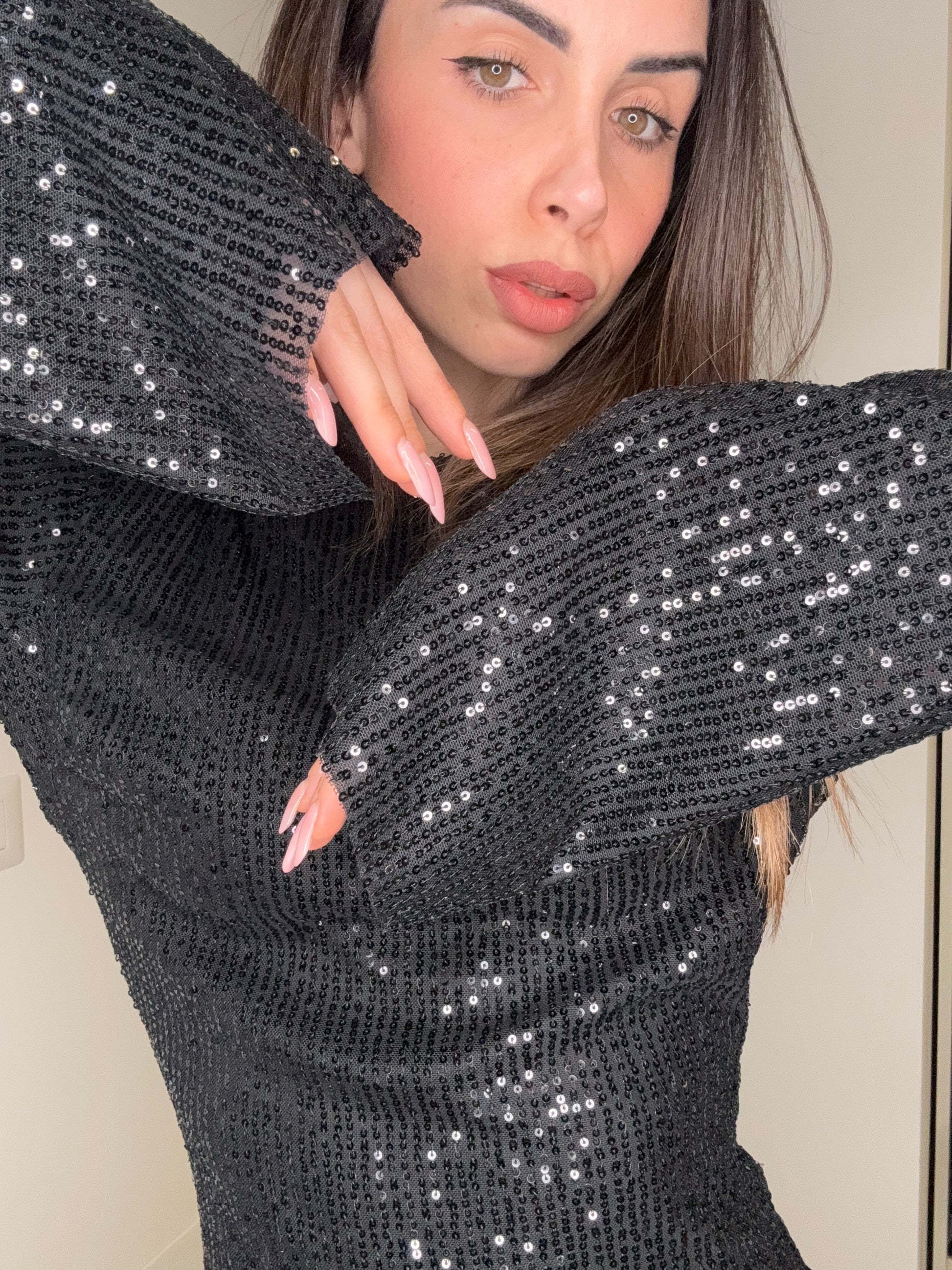 Il Mini Abito Lux è pensato per chi ama brillare senza compromessi. Interamente ricoperto di paillettes, riflette la luce ad ogni movimento creando un effetto luminoso e magnetico.