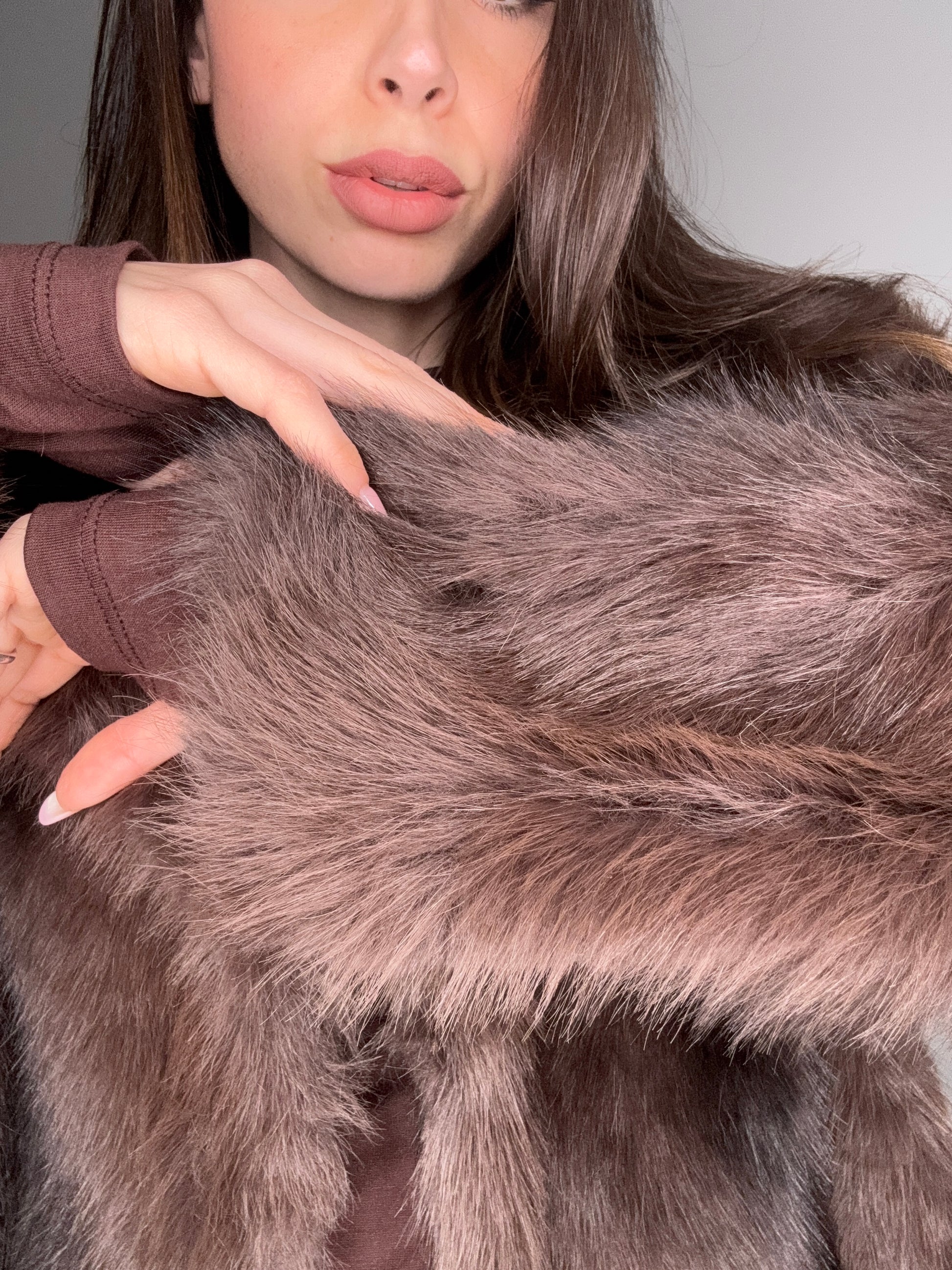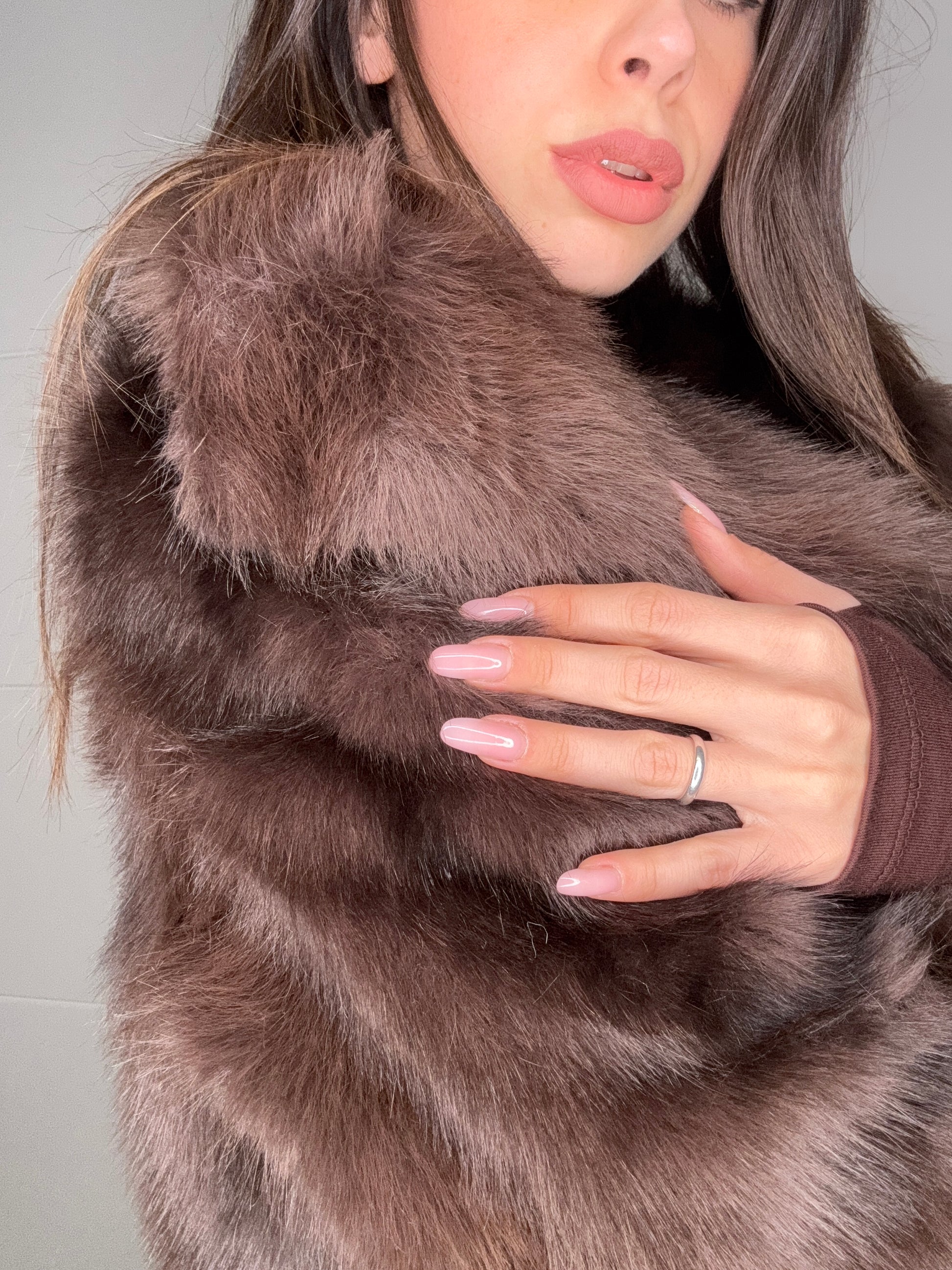 La Brown Velvet Fur unisce design moderno e comfort assoluto. Realizzata in morbida ecopelliccia, avvolge la figura con la sua texture vellutata e il raffinato colore marrone cioccolato. La taglia unica la rende perfetta per ogni corpo e occasione, dal giorno alla sera.